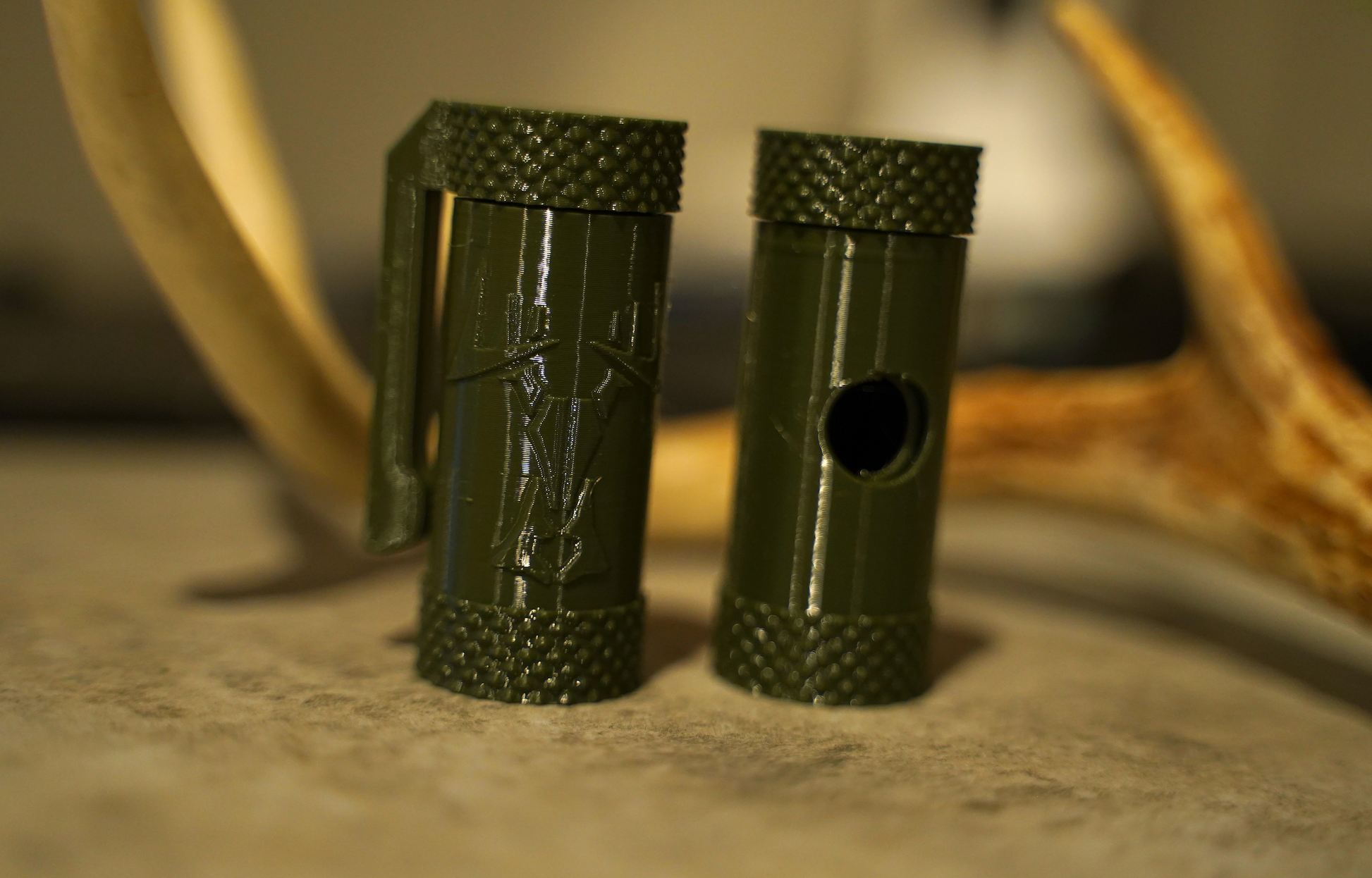 This is a small milkweed holder that comes in a two-pack. It swivels so you can easily pull out milkweed to check the wind while deer hunting. Clip it to your bino harness or pack, or just slip it in your pocket. A simple, handy way to drop milkweed and see what the wind and thermals are really doing.